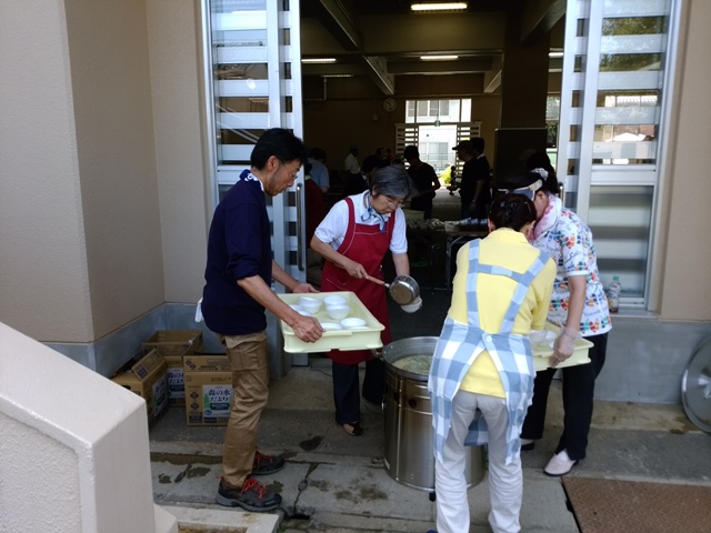 非常食アルファ米で五目御飯の炊き出し盛り付け